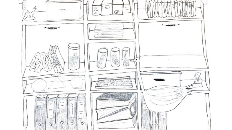 Bild: Clara Richter und Paula GötzeNach Haeckels Tod wurde sein Hirn entnommen, eingelegt und ausführlich im Kontext der “Elitegehirn-Forschung”untersucht. Diese ging davon aus, dass eine weiße, europäische und männliche Elite die höchste Entwicklung der Menschheit darstellt. In kolonialisierten Gebieten ansässige Volksgruppen wurden hingegen einem niedrigeren Entwicklungsstand zugeordnet, womit Unterdrückung und Ausbeutung legitimiert werden sollten. Um die Ungleichbehandlung menschlichen Lebens zu problematisieren, wird im inszenatorischen Konzept Haeckels Herz der “Kopfhaut eines Herero” gegenübergestellt. Diese gelangte vermutlich während des deutschen Genozids an den Herero unrechtmäßig nach Jena. Das Konzept sieht vor, beide Objekte in der Illustration eines Archivregales abzubilden, welche dem Archiv des Phyletischen Museums nachempfunden ist. In diese Illustration sollen zwei Klappen integriert werden, hinter denen sich Informationen sowie eine Visualisierung des massiven Unterschiedes im Umgang mit den Objekten befinden. Die größte Herausforderung dieses Konzeptes besteht darin, die Ungleichbehandlung darzustellen, ohne sie zu reproduzieren. Ob dies gelingt, gilt es noch zu testen.