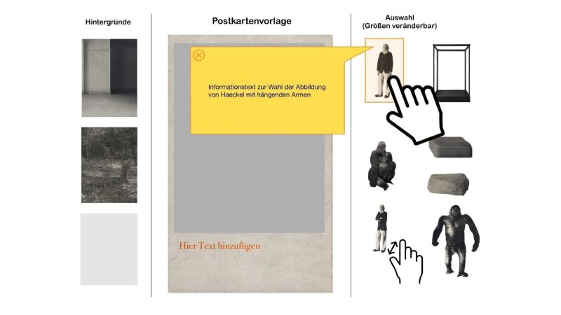 Bild: Fanny Anna Feierabend, Franz Oeser, Judith TaubertIm Rahmen der interaktiven Station zur Postkarte Ernst Haeckels mit dem Gorilla-Präparat sollen Besucher*innen durch eine informationsbegleitete, digitale De- und Neukonstruktion der Postkarte dazu angehalten werden, die kolonialen, anthropozentrischen und patriarchalen Strukturen als Kontext für Haeckels Inszenierung seiner originalen Postkarte kritisch zu hinterfragen. Durch die Möglichkeit zum nachträglichen Kommentieren anderer Entwürfe entsteht zudem ein offener Raum für konstruktiven Austausch.
