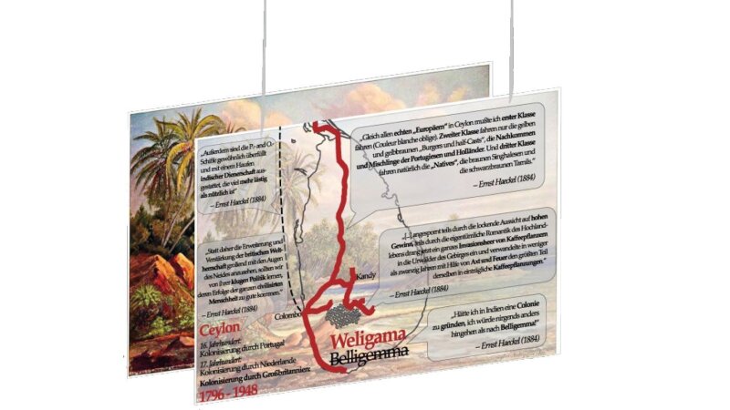Bild: Skadi Pest, Anna-Amina ZeidanDie Intervention “Haeckels koloniale Reise ins Bild gerückt” will anhand des Gemäldes Cocos-Insel bei Belligemma (1881) Ernst Haeckels Forschungsreise nach Indien und Ceylon in ihren kolonialen Kontext einordnen. Die paradiesische, unberührte Landschaft des Gemäldes soll durch unbequeme koloniale Realitäten gestört werden, die im Bild unsichtbar sind. Beim Aufdecken dieser Realitäten hilft Haeckel selbst: Zitate aus seinen Reisetagebüchern sollen seine Rolle innerhalb des kolonialen Systems sichtbar machen.