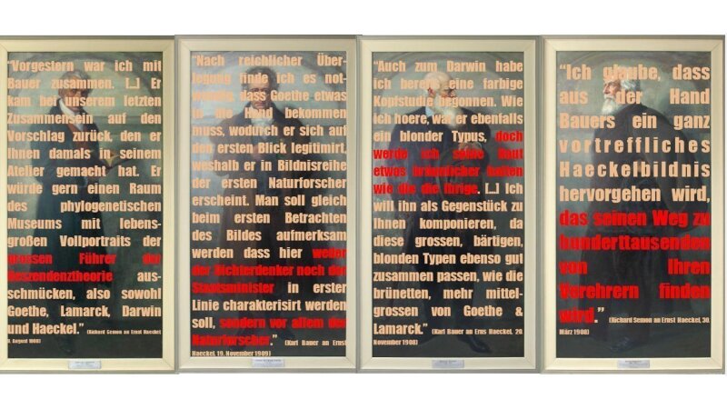 Bild: Finn Lennart Blug, Hendrik GrafDie Intervention befasst sich mit der Frage, wie ein Umgang mit dem Mythos des Genies aussehen könnte. Im Mittelpunkt steht die Gemäldereihe, die vom Künstler Karl Bauer selbst als „Die Heroen der Entwicklungsgeschichte“ bezeichnet wurde. Wie lässt sich eine einseitige, glorifizierende Perspektive auf diese Wissenschaftler aufbrechen? Durch die Installation einer Glasscheibe sollen Besucherinnen und Besucher dazu gebracht werden, andere Perspektiven einzunehmen und sich kritisch mit der Inszenierung von Wissenschaftlern auseinanderzusetzen. Zitate aus dem Schriftwechsel zur Beauftragung und Absichten der Großgemälde sollen auf die Scheibe projiziert werden und temporär sichtbar und unsichtbar sein. So kann das jeweilige Bild ungestört aus jeder Perspektive betrachtet werden. Die Intervention möchte eine Auseinandersetzung mit der ideologischen Haltung Karl Bauers und Ernst Haeckels anregen.